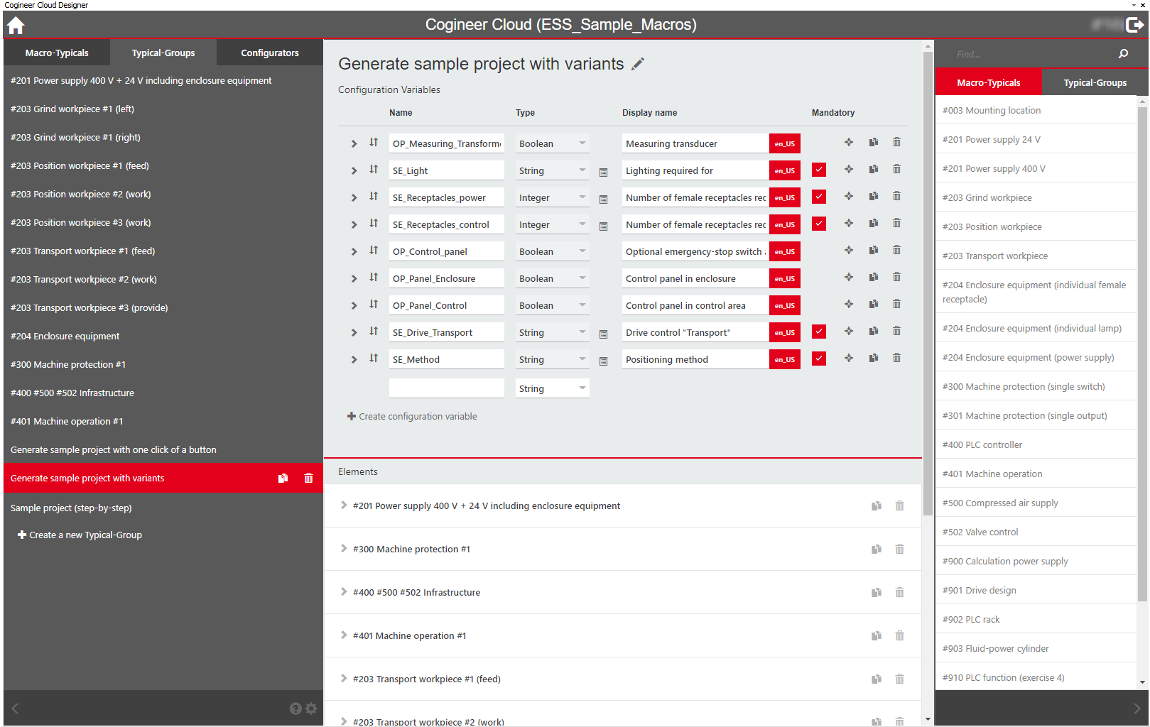 - Auf der linken Seite befindet sich eine Seitenleiste, in der Ihnen alle Makro-Typicals, Typical-Gruppen und Konfiguratoren angezeigt werden, die in der aktuell geöffneten BibliothekEine Bibliothek ist ein Makroprojekt, das alle Elemente enthält, die Sie zum Abbilden der einzelnen Module Ihres Produkts benötigen. Dazu zählen Makros, Makro-Typicals, Typical-Gruppen und Konfiguratoren. vorhanden sind. In drei Registerkarten können Sie durch alle verfügbaren Elemente navigieren oder neue Elemente erstellen.