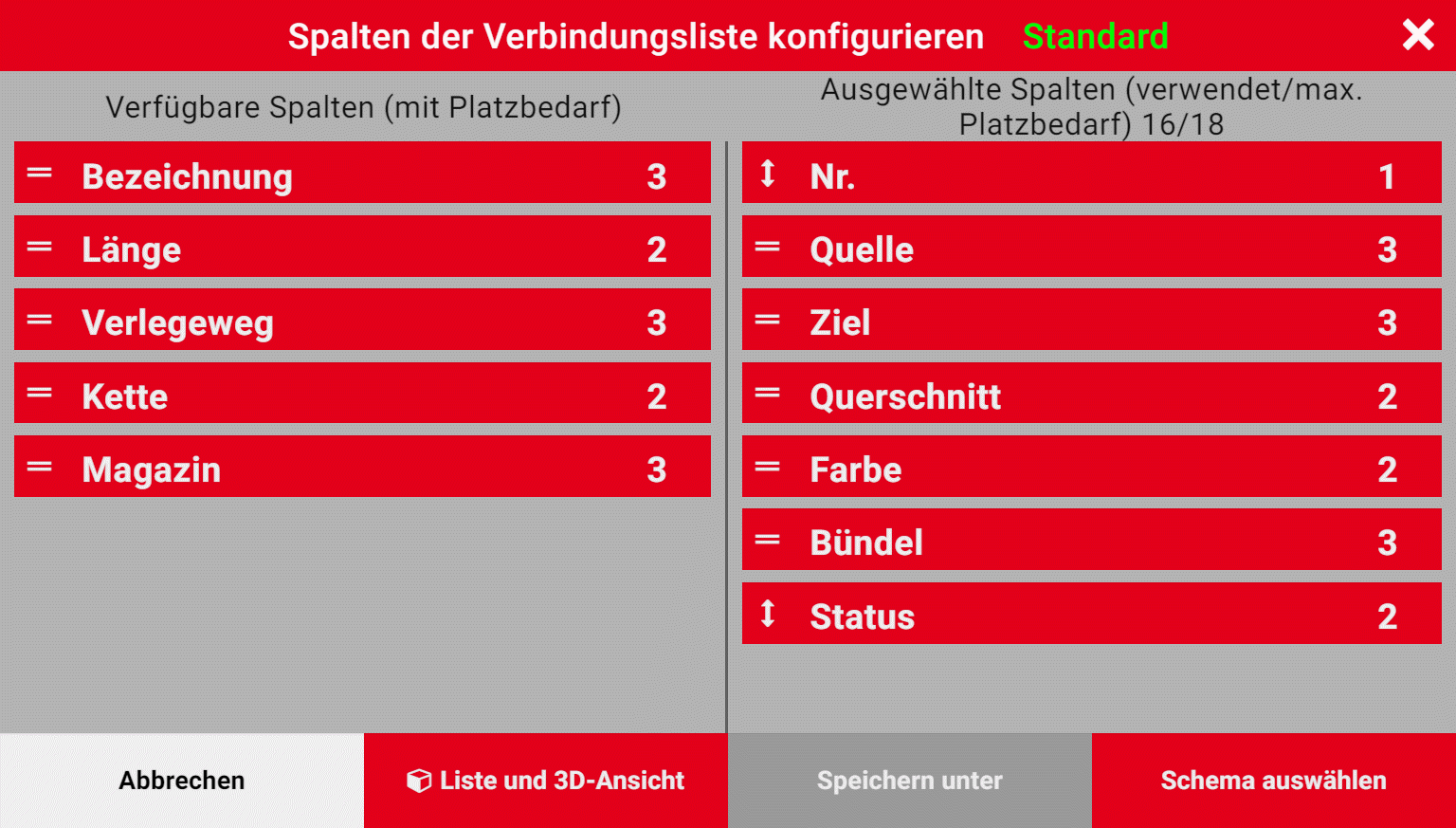 - Als Standardschema wird Ihnen eine Spaltenkonfiguration angeboten, welche die Verbindungseigenschaften Nr., Drahttyp, Quelle, Ziel, Querschnitt, Farbe,, Bündel und Status enthält.