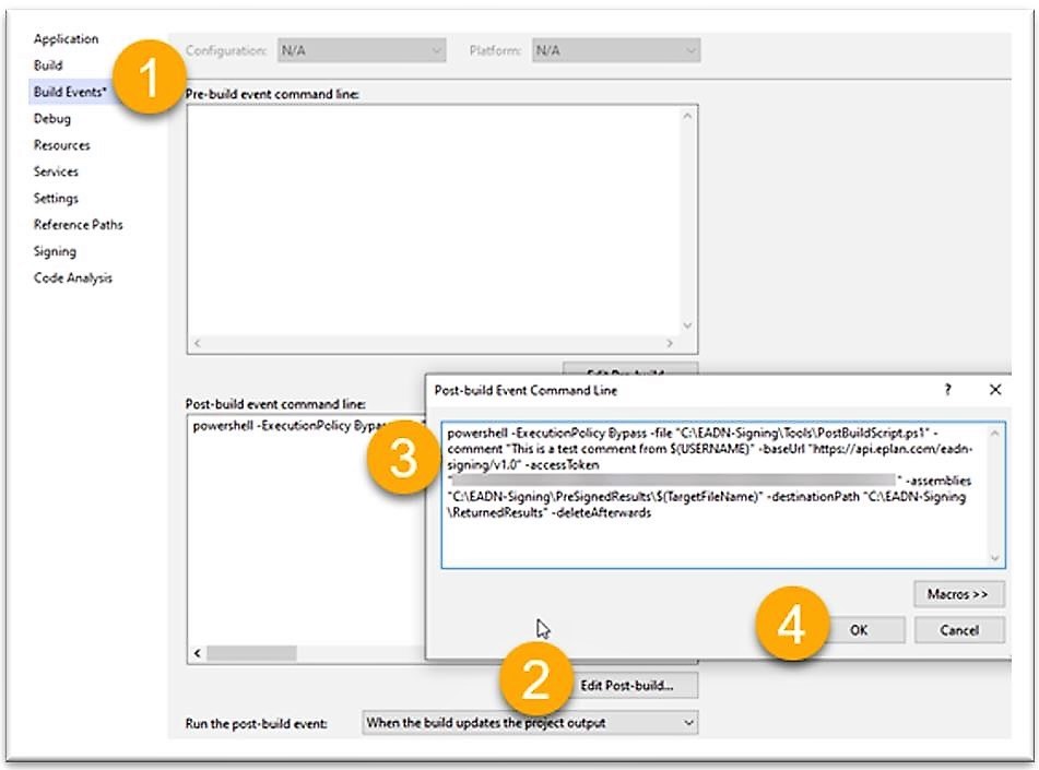 Download the provided PowerShell script from the Developer Portal EADN Singing for using it in Post-build event of Visual Studio.