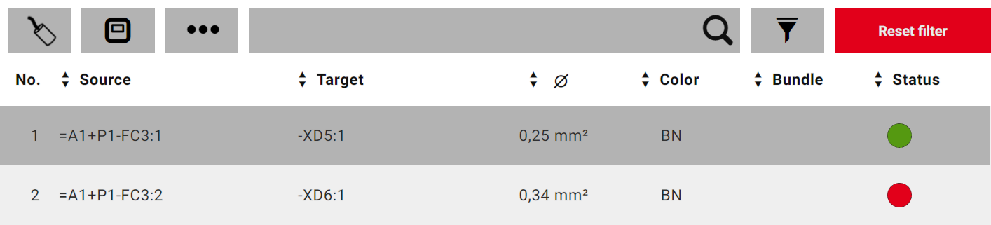 - Note that for the selected connection type "Cable" in the connection list, you cannot search and/or filter for the connection properties of the individual cable connection (cable conductors).