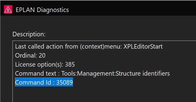 To find the correct Command.ID value for the command, you can check the description log in the EPLAN Diagnostics dialog after calling this action from the ribbon (to show the Diagnostics Dialog press [Ctrl] + [VK_OEM_5]. [VK_OEM_5] corresponds to the [^] key on a German keyboard or to the [\] on a United States 101 keyboard.):